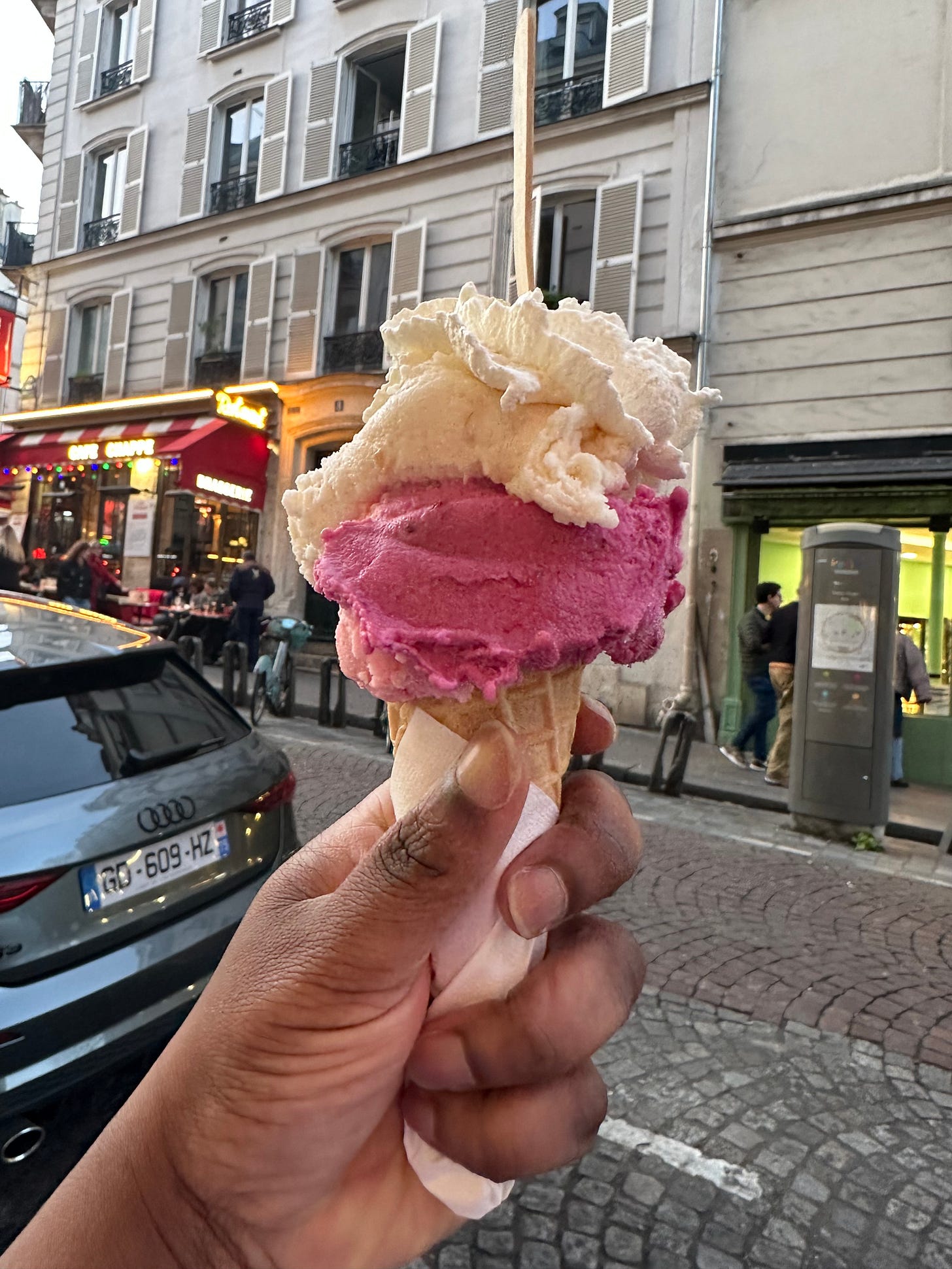 Although it was not very sweet, it was refreshing and I see how it could be more soothing on a hot day versus a basic 45 degree day. The flavors I got were blackberry, apricot, and pistachio with whipped cream. I found that apricot is a popular flavor in Paris and I saw it on most ice cream menus.